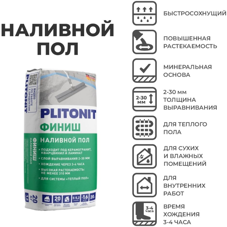 Ровнитель (наливной пол) Финишный Plitonit (Плитонит) финиш самовыравнивающийся быстротвердеющий 20 кг
